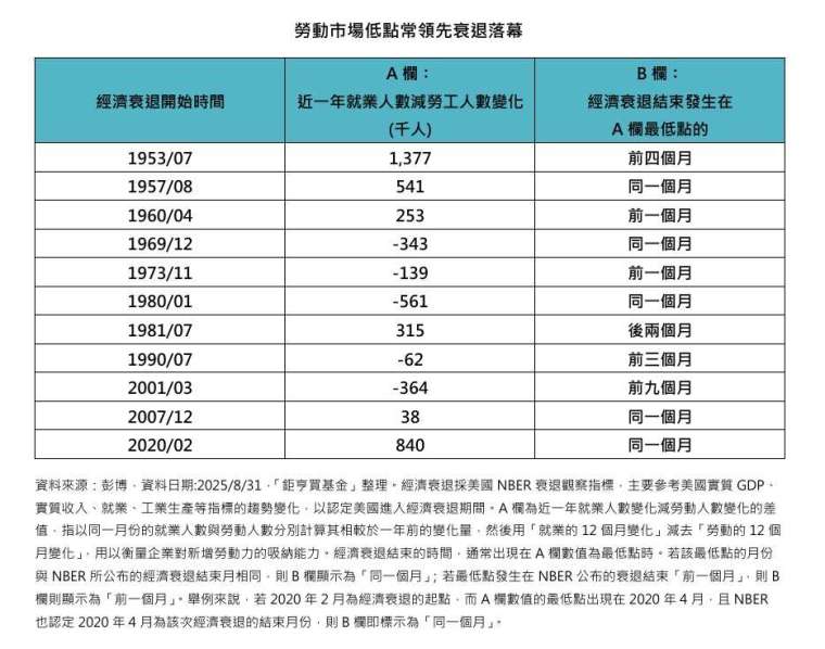 參考美國歷次衰退經驗,經濟衰退的起點與「近一年就業人數變化減勞動人數變化」的數值確實存在一定關聯,但並無明確的固定門檻。有時該數值轉負即進入衰退,有時即使仍在正值高檔,仍可能陷入衰退,因此難以用單一絕對水準界定衰退起點。相較之下,衰退終點較易辨識。回顧過去 11 次美國經濟衰退,幾乎每一次在「近一年就業人數變化減近一年勞動人數變化」的差值出現最低點時,當月或前數個月,經濟便宣告結束衰退,僅有 1981 年 7 月的衰退是於該數值落底後第二個月才結束。若將此經驗套用於當前週期,倘若今年 4 月確為本輪最低點,那麼本次經濟衰退的結束時間,很可能已落在今年 1 月至 6 月間。