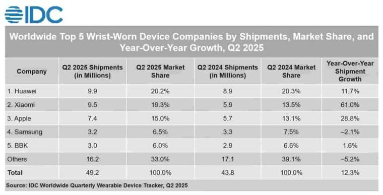 根據國際數據資訊(IDC)發布的 2025 年第二季全球穿戴裝置報告,智慧手錶市場迎來了一場激烈的版圖重整。儘管整體市場出貨量年增 12.3%,達到 4,920 萬台,但品牌排名卻出現驚人逆轉。