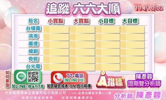 權值股方面,以下六檔股票,如果有把彥蓉的【66 大順】表格帶回去的朋友,全買在低點附近,台積電 (2330-TW) 漲300 元,鴻海 (2317-TW) 漲 34 元,廣達 (2382-TW) 漲 69 元,緯創 (3231-TW) 漲 43%,奇鋐 (3017-TW) 漲 170 元, 台光電(2383-TW) 漲 300 元! 目前看法 台積電 緯創 廣達 鴻海 拉高站賣方,奇鋐 台光電 股票逢拉回表格觀察小買點上車時機,【66 大順】表格歡迎索取表格按表操課。