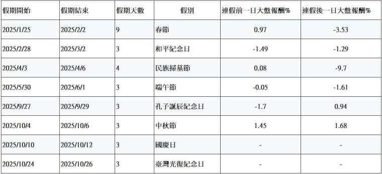 2025 連假有哪幾天? 連假前後加權指數報酬整理