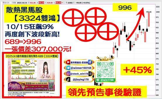 (3324-TW)雙鴻,689=>996 領先預告後大漲 +45%,今日亮燈漲停,明顯領漲散熱族群,主要受惠於 AI 伺服器液冷需求持續升溫,GB300 冷板自 9 月起已開始出貨,法人預期第三、四季液冷營收將超越氣冷,全年伺服器液冷營收占比有望突破三成,再加上近期月營收連續創新高,市場對未來成長動能高度期待,吸引法人積極卡位,推升股價創下波段新高,短線多方氣勢強勁。