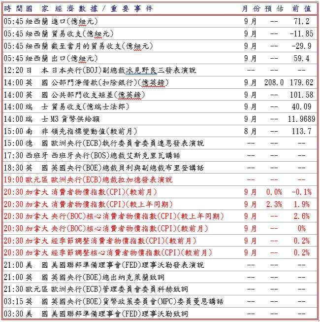 昨日紐西蘭第三季消費者物價指數 (CPI) 較前季升 1.0% 及上年同期漲 3.0% 高於前值,並據中國人民銀行 (PBOC) 分別維持一年與五年期貸款市場報價利率 (LPR) 於 3.00% 及 3.50%,而且中國第三季國內生產總值 (GDP) 與 9 月零售銷售分別較去年同期增長 4.8% 及 3.0% 符合預期,9 月工業生產較上年同期升 6.5% 則超過預估值,並受中國與美國貿易樂觀及法國局勢緩和推動風險信心回歸,扶助澳幣與紐元反彈,歐元兌美元則觸及 1.1675 高點。