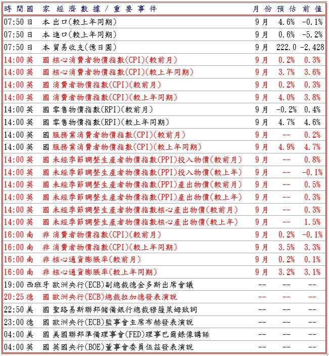 週二市場等待週三公布的 9 月英國通貨膨脹數據,可能影響對英國央行 (BOE) 的政策預期和英鎊走勢,促使英鎊兌美元受限於 1.3416 高點。隨著數據顯示英國本納稅年前六個月的政府借款總額較去年同期增長 13% 達 998 億英鎊,比英國預算監督機構的預測高 72 億英鎊,規模創紀錄最高,讓財政大臣里夫斯準備下個月重要預算的壓力倍增,打擊英鎊兌美元至 1.3358 低點。預估今日英鎊兌美元阻力於 1.3370-90,支撐於 1.3270-90。