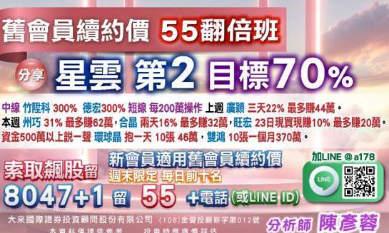 預告 星雲 (8047-TW),15 天翻倍 140%。【星雲 第 2】,即將發動目標翻倍,加 line 留言【777+2】索取。