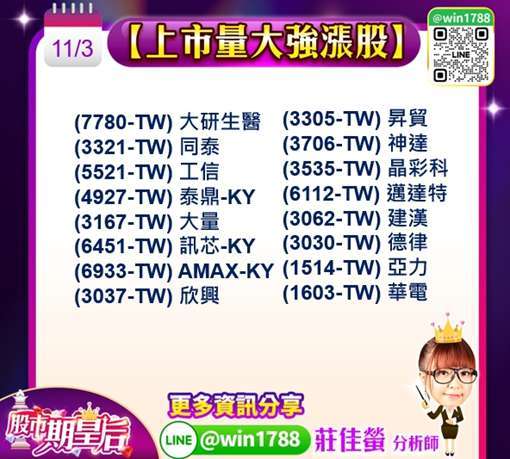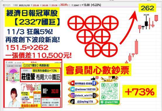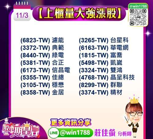 盤面上表現亮眼的股票都是我們點名預告在前面的族群,被動元件族群方面,(2327-TW) 國巨,展望第 4 季預期優於季節性表現,受惠電子需求增強、鉭電容價格上揚與芝浦電子併購效益,預估第 4 季營收季增 4%、毛利率 36.3%、EPS 3.21 元,明年產能利用率可望再提升,全球市場氣氛熱絡,國巨與三星電機皆看好 AI 伺服器及車用電子帶動 2026 年 MLCC 需求維持雙位數成長,日本村田亦於法說會上調財測,營收較 4 月預估成長 6.1%,受惠日圓貶值及零組件需求擴張,激勵下,10 月 31 日全球被動元件族群大漲,三星電機與村田分別勁揚 8.89% 與 11.91%,帶動板塊全面走強,預計被動元件類後續將有表現空間。
