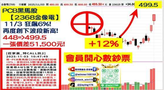 (2368-TW) 金像電,448=>499.5 領先預告後大漲 +10%,亞馬遜雲端部門 AWS 上季營收年增 20%,創近三年最大增幅,其自研 Trainium2 晶片全數被預訂一空,帶動 AWS 供應鏈全面噴出,法人指出,金像電受惠美系 CSP 客戶 AI ASIC 需求強勁,營收連創新高,市場預期 2025 年 EPS 有望年增三成,加上泰國新廠即將量產,外資目標價上看 577 元。