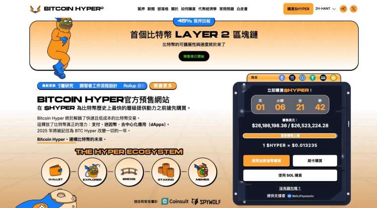 比特幣震蕩整理的同時,部分資金開始流入具備成長性的科技型項目。最亮眼者莫過於 Bitcoin Hyper($HYPER)代幣,這個定位為比特幣 Layer2 的新生態系統,預售資金已突破 2,600 萬美元,且在過去 24 小時內新增超過 50 萬美元。