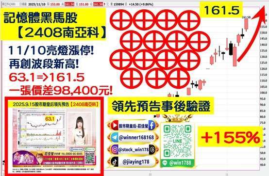 (2408-TW) 南亞科,63.1=>161.5 領先預告後大漲 + 155%,南亞科為全球第四大 DRAM 製造商,產品涵蓋利基型與消費型 DRAM,受惠於 AI 伺服器與雲端資料中心需求強勁,近期營運動能明顯升溫,10 月營收創下 50 個月新高,年增逾 260%,顯示基本面快速改善,預期隨著 DRAM 合約價持續上揚及庫存水位下降,南亞科 2025 年下半年有望轉虧為盈,整體多頭氣勢未減,法人看好其產能利用率提升與產品結構優化,後市具持續成長潛力。