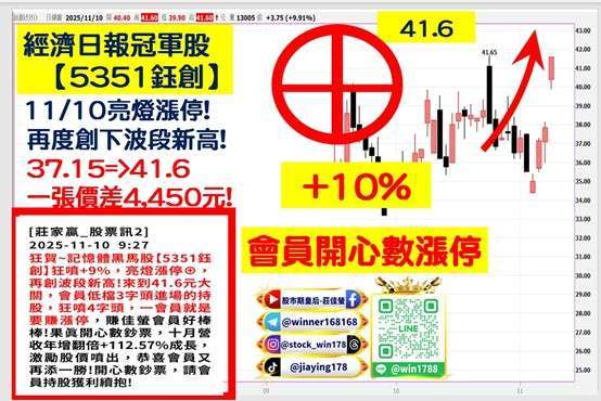 (5351-TW)鈺創,37.15 => 41.6 領先預告後大漲 +10%,主力業務為利基型記憶體 IC,專注特殊型記憶體及客製化晶片,受惠 AI 與雲端需求強勁,近期營收連續創高,10 月年增率高達 112.57%,連續三個月刷新紀錄,基本面轉強,外資與主力同步加碼,短線多方氣勢明顯,後續仍有挑戰新高的機會,隨著 AI 應用持續擴大,DDR4 等記憶體需求升溫,鈺創題材明確。