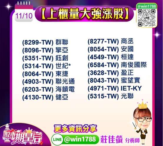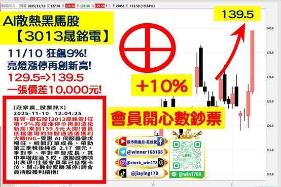 (3013-TW)晟銘電,129.5=>139.5 領先預告後大漲 +10%,為知名 OEM/ODM 代工廠,主力涵蓋 PC、NB 及 Server 機構件,近年積極切入 AI 伺服器領域,受美系大客戶訂單放量及 Sidecar 新專案出貨帶動,營收動能明顯回升,AI 伺服器訂單旺 Q3 獲利年增逾 3 成,今年前三季營收 75 億元,年增 11.49%;毛利率 17.47%,年增 2.01 個百分點;營益率 9.09%,年增 0.86 個百分點;稅後純益 5.01 億元,年增 15.4%,每股純益 2.44 元。,法人看好年底前 Meta 大客戶量產出貨,可望持續推升市場信心。