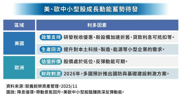 塞達提進一步說明,歐洲小型股方面雖與美國小型股在結構上有所不同,儘管過去經歷疫情干擾、供應鏈中斷與關稅衝擊,歐洲中小型公司仍成功維持與大盤相近的盈利增長。而資金之前自該資產類別流出,導致股價低企與流動性減弱,但這亦意味著接下來可能的逆轉潛能。此外,預計在 2026 年,多個歐洲國家將於國防與基礎建設領域推出政府財政政策刺激,加上中小型公司通常在經濟擴張與復甦期受惠於較高營運槓桿,因此歐洲中小型股票亦有望迎來波段機會。