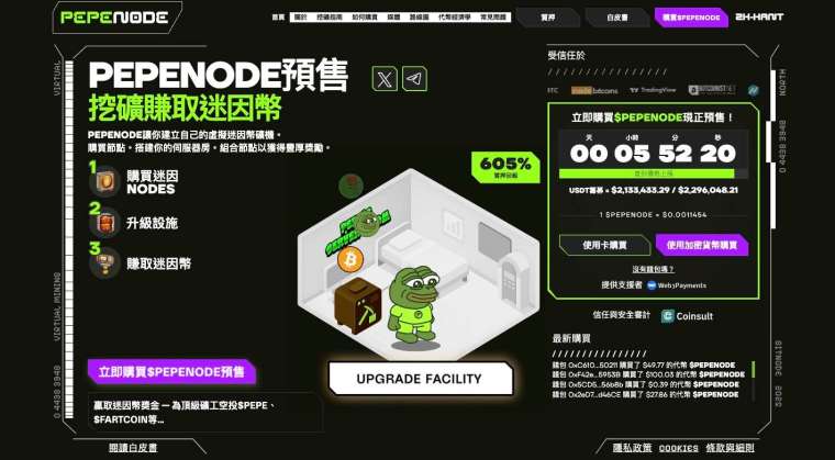 Pepenode($PEPENODE)則代表迷因幣的另一個新分支:將挖礦、遊戲化與高收益質押結合。作為 PEPE 宇宙的新延伸,Pepenode 在以太坊鏈上推出 Miner Nodes 系統,讓持有者以遊戲形式打造屬於自己的虛擬挖礦房間。透過升級設備、提升 Power 值與解鎖更高級階的 Miner Nodes,玩家獲得的代幣獎勵將呈現倍數成長。