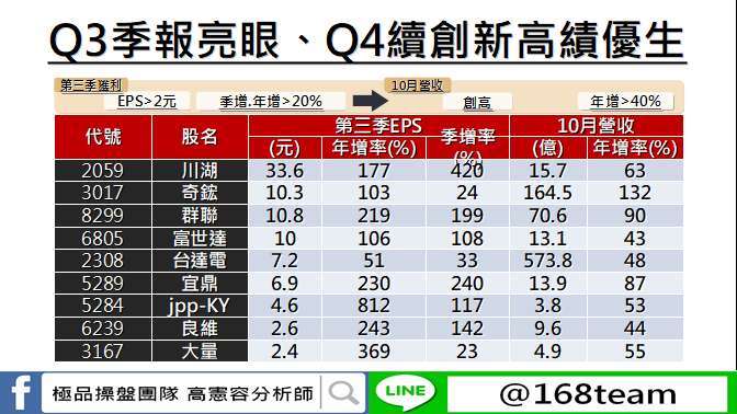 高憲容分析師最近趁著第三季財報及 10 月營收公布,也精選了 10 檔 Q3 財報亮眼 (單季 EPS 2 元以上,年增率、季增率都超過 20% 以上),且 Q4 持續成長(10 月營收創新高、且年增率超過 40%) 公司,供大家選股參考。
