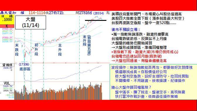 邪惡第五波何時結束?高憲容分析師提醒接下來萬一大盤出現無論漲跌、融資餘額都持續攀高,指數遲遲未能再創新高,成交量能明顯減弱,而台積電跌破 10/23 低點後,若反彈未能站回月線,則大盤就有形成頭部區的疑慮,準備開始回檔整理。