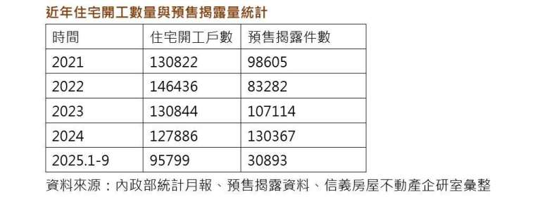 全台房市急凍,統計建案開工與預售揭露量表現,20255 年則是賣得遠比開工量還少很多,預售揭露全台前三季只賣了 3 萬戶,房仲業者推估全年僅及 2024 年的 3 成,但今年全年的開工數量推估將達 11 萬戶,若外在環境沒有出現轉機,長期新建餘屋可能會逐漸增加。