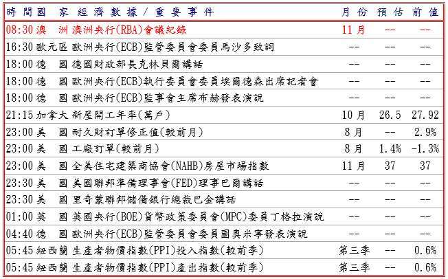 澳洲一系列數據意外強勁,強化澳洲央行 (RBA) 寬鬆周期或已結束的臆測,互換市場預計 RBA 明年 5 月再降息的機率僅 40%,並關注 RBA 週二公布 11 月會議紀錄及週三澳洲季度工資數據,但美國政府結束史上最長停擺,週四的就業報告可能決定下月 FED 是否降息,促使投資人調整倉位,引發澳幣和紐元下滑,歐元兌美元則自 1.1624 高點走低。