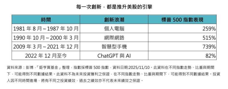 這時你又會問:「現在進場還來得及嗎?」回顧過去,美股歷經無數次波動,從 1987 年全球股災、2000 年網路泡沫、2008 年金融海嘯,到 2020 年疫情衝擊,每一次危機過後,都再次創下新高。支撐這份韌性的關鍵,正是美國企業源源不絕的創新動能。自 1980 年的個人電腦革命以來,標普 500 指數上漲了 259%;1990 年網際網路浪潮再推升 515%;2009 年智慧手機帶動大漲 739%;而自到 2022 年由 ChatGPT 掀起的 AI 革命又推升了 82%。每一波創新浪潮都推升了「企業獲利」與「指數價值」,讓標普 500 指數成為全球最具代表性的「長期成長型資產」。