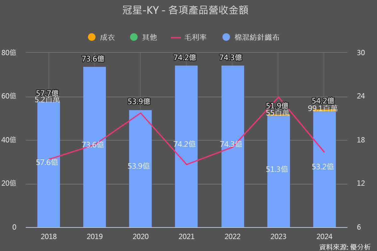 冠星KY(4439-TW)為短纖布料製造廠,擁有織布與染整產能,主要生產銷售棉混紡針織布料,大量應用於運動休閒外套與內衣布料,營運模式為透過與品牌商接洽,依需求製作樣品,或主動推薦新開發之布料,並由品牌商向配合之成衣廠下單。
