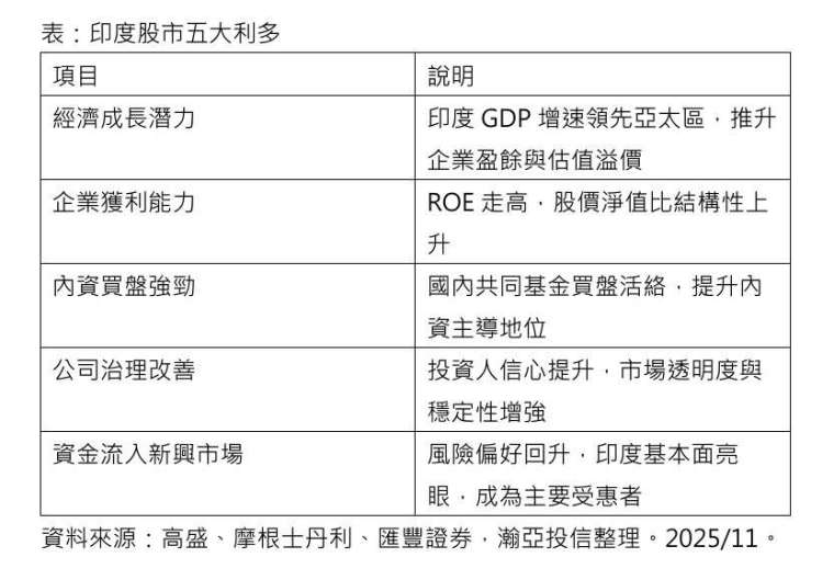 第三、國內共同基金買盤強勁,改變市場結構,提升內資主導地位。第四、過去十年公司治理大幅改善,投資人信心顯著提升。第五、風險偏好回升,資金流入新興市場,印度憑藉亮眼基本面與市場深度,成為主要受惠者。
