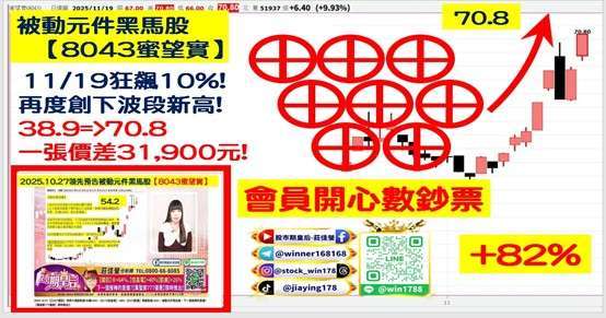 蜜望實 (8043-TW),38.9=>70.8 領先預告後大漲 +82%,主要代理日本知名被動元件品牌,深耕電子零組件通路,在智慧裝置需求成長的帶動下,營運動能持續強化,近期月營收表現亮眼,10 月營收年增高達 59%,並連續 45 個月創下新高,基本面動能相當扎實,技術面上,多頭訊號明確,吸引法人積極布局,近期被動元件族群整體抗跌,蜜望實在基本面成長、法人買盤與技術面強勢共振下,成為盤面焦點。