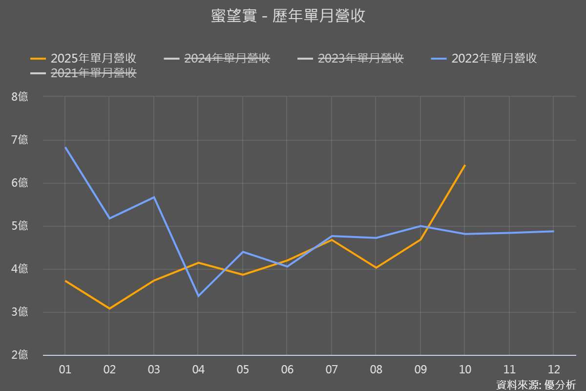 蜜望實目前的庫存金額與營收兩者之間,出現了明顯不匹配:2025 年第三季底的庫存金額仍較 2022 年庫存高峰 13 億元低了 16%,但 10 月單月營收卻已衝上 6.4 億元,逼近 2022 年歷史最高單月 6.8 億元。