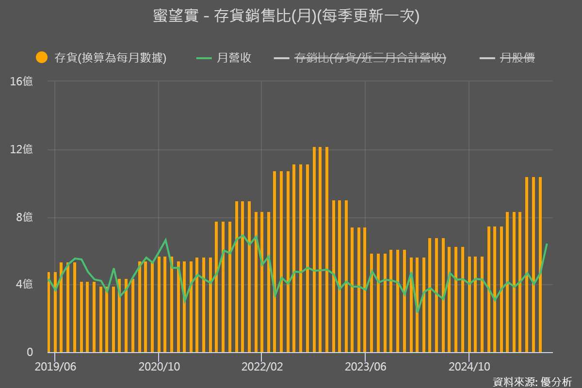 蜜望實目前的庫存金額與營收兩者之間,出現了明顯不匹配:2025 年第三季底的庫存金額仍較 2022 年庫存高峰 13 億元低了 16%,但 10 月單月營收卻已衝上 6.4 億元,逼近 2022 年歷史最高單月 6.8 億元。