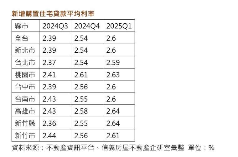 根據不動產資訊平台顯示,不包含優惠房貸的一般房貸利率,2025 年第一季平均新增房貸的平均利率為 2.6%,寫下 2008 年底金融海嘯後的新高,比較特別的是房貸利率通常跟央行升息有關,但過去這段時間利率已經沒有調升,但新增房貸的利率較 2024 第二季仍增加了 0.24 個百分點。