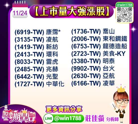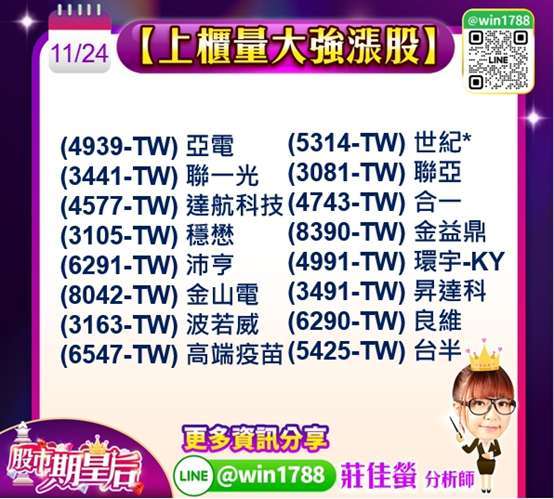 (8043-TW) 蜜望實,38.9=>88.5 領先預告後大漲 +127%,主要代理日本知名被動元件品牌,深耕電子零組件通路,在智慧裝置需求成長的帶動下,營運動能持續強化,近期月營收表現亮眼,10 月營收年增高達 59%,並連續 45 個月創下新高,基本面動能相當扎實,技術面上,多頭訊號明確,吸引法人積極布局,近期被動元件族群整體抗跌,蜜望實在基本面成長、法人買盤與技術面強勢共振下,成為盤面焦點。