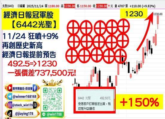 (6442-TW) 光聖,492.5=>1230 領先預告後大漲 +150%,專注光通信元件與高速光纖模組,受惠 AI 伺服器與資料中心升級潮,營收年增率飆升至 71%,主要來自美系客戶強勁拉貨,CPO 新產品布局加速,並隨輝達財報利多及 Google 推出 Gemini 3,市場對高速光纖需求持續升溫,全球北美四大 CSP 擴大資本支出,帶動光通訊族群前景亮眼,此外,CSP 大客戶拿下馬來西亞資料中心標案,第 3 季起全面出貨,有望推動光聖業績延續成長動能。