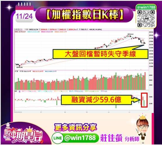 今日台股開高走強,一度攻上 26,764.13 點,大漲 329.19 點,盤中漲幅收斂,開高走低,終場上漲 69.30 點,收在 26504.24 點,成交量 7130.14 億,今日收量增黑 K 棒,盤中雖有站回季線,不過暫時失守,但台股距離季線 26507.57 點,僅差 3.33 點,隨時有機會站上,加上季線上揚有一定的支撐力道,上週五融資已大減 59 億元,有利於籌碼沉澱後換手,只要未來融資能夠大幅減肥,將有利於未來反彈格局,個股方面,電子權值股表現穩健,中小型族群則出現明顯輪動,包括光學、PCB、光電、遊戲、記憶體、軍工等族群表現亮眼,其中 CPO 矽光子族群強勢上演噴出秀;