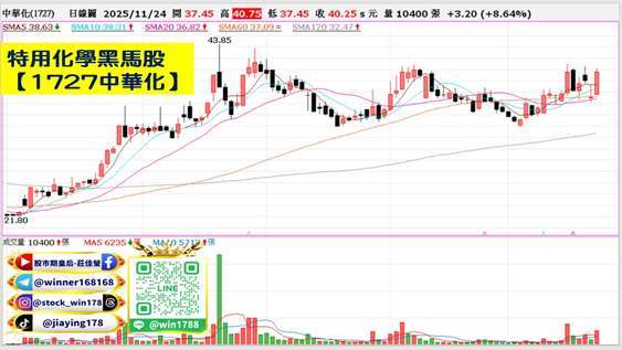 (1727-TW) 中華化,將是可留意的標的,今日上漲 8.64%,為國內主要硫酸生產商,積極布局半導體電子級硫酸產線,同時拓展國防工業與特用化學市場,法人仍看好 2026 年起新產線與國防訂單的貢獻,評價具上修空間,主因半導體級硫酸產線即將量產,高毛利效益可望在 2025 年底前開始反映,吸引外資與主力提前卡位,市場焦點正回到產業升級與新訂單前景,短線資金仍偏多。