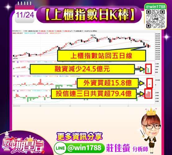 另外代表中小型股的櫃買 OTC 指數,不僅在上周五融資大減 24 億元,今日更是開高走高,強彈 1.78%,人氣回溫,收紅 K 棒,也強勢站穩五日線,半年線之上;目前中小型股將強於權值股,不過隨著 10 月營收與 Q3 公佈之後,更加確立台股的基本面無虞,上市櫃 Q3 獲利出爐,受惠於 AI 需求強勁,上市櫃公司加計金控自結,Q3 稅後淨利達 1.29 兆元,季增 51.71%、年增 14.86%,創下單季歷史新高,上市櫃 10 月總營收達 4.64 兆元,年增 11%,為史上最強 10 月,優於預期,外銷訂單受惠 AI 助攻連 9 紅!10 月 693.7 億美元,創歷年同月新高,年增 25.1%,寫連九紅,都繳出亮眼成績單下,台股有望在降息機率大增下,賣壓可望緩和,市場關注美國是否放寬中國 AI 晶片出口限制,以及美國前總統川普提出的「28 點俄烏和平計畫」對全球資金流向的可能影響,在總經面與國際情勢牽動下,本週市場焦點將落在美國 PCE、PPI、密大消費者信心等數據,以及金控股法說會,短線而言,在利率預期翻轉與科技股買盤回籠的助力下,展望後市,預期年底前「做夢行情」可望延續,資料中心擴建與 AI 投資動能仍強,台股中長線格局不變,震盪中仍偏多看待,選股將重於選市。