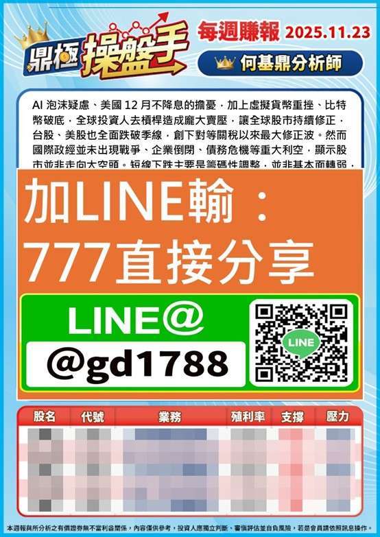 近期市場受到多重利空衝擊,包括 AI 泡沫疑慮、美國 12 月可能不降息的擔憂,加上虛擬貨幣重挫、比特幣跌破區間低點,導致全球投資人加速去槓桿,形成龐大賣壓,使得全球股市持續修正。台股、美股同步跌破季線,跌幅創下「對等關稅」以來最大修正波,市場情緒明顯偏空。
