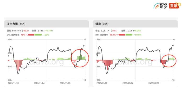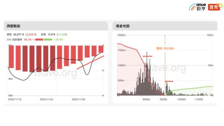 值得注意的是,爆倉地圖顯示,上方大量空單遭清算! 現存大空單爆倉區位於 9.4 萬美元附近,下方還未見激進多頭,最大多單爆倉區落在 8.4 萬美元以下;從擠壓動能來看,趨勢開始扭轉,顯示多日空方動能衰退,空頭拋壓逐步減弱,為行情轉強的中繼訊號!