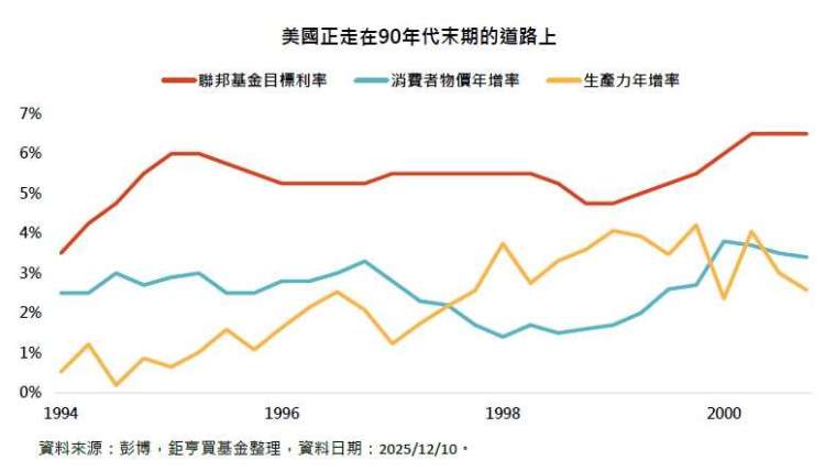 鉅亨買基金認為,聯準會對通膨的預估可能過於樂觀。當前全球正處於科技帶動的新一輪 J 曲線(投資生產力曲線)起點,大規模投入 AI 的資本支出先推升總需求,短期內帶來更強的物價壓力。但在資本形成擴大、生產力開始反映於實體經濟之後,這股動能將轉化為更高的經濟成長。也因此,在這個新的經濟架構下,美國經濟其實有能力短期容忍更高的通膨與相對更寬鬆的貨幣環境。