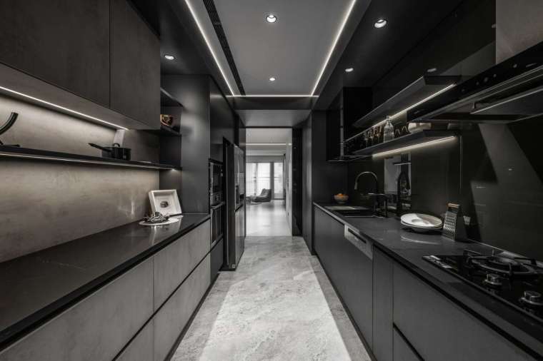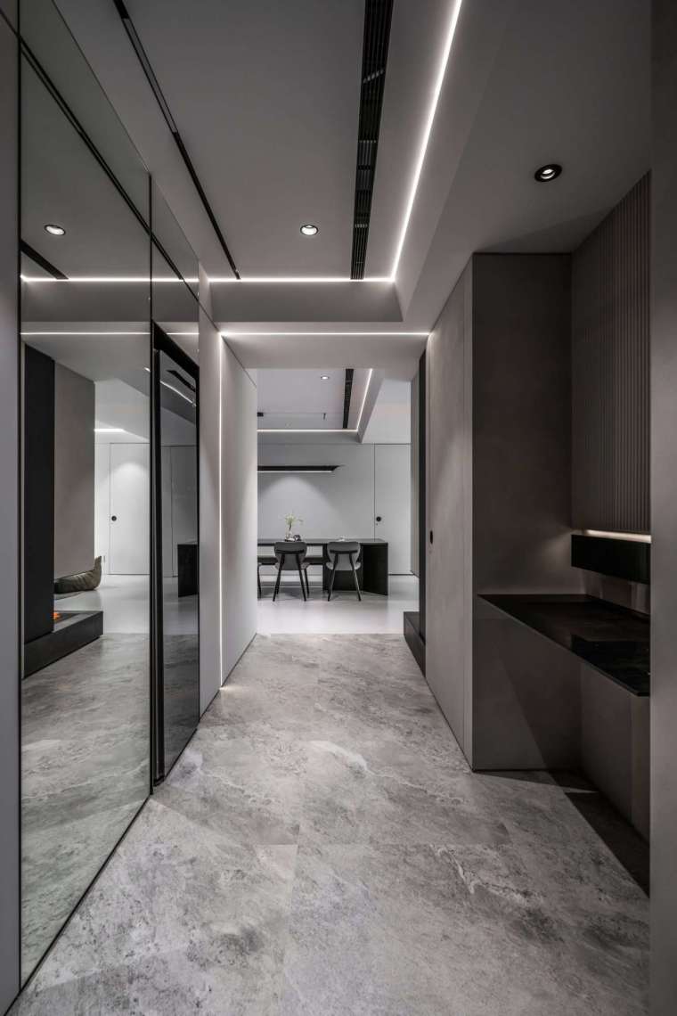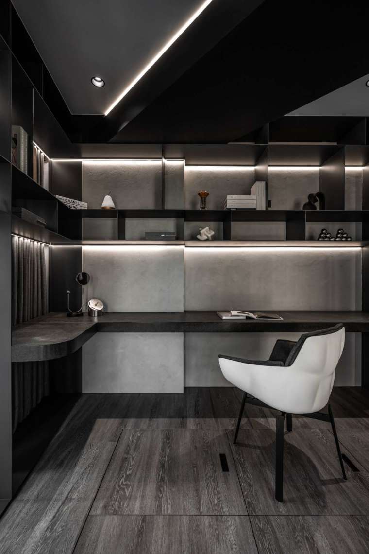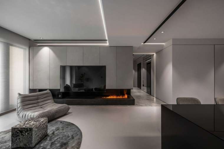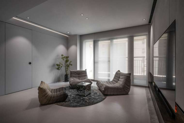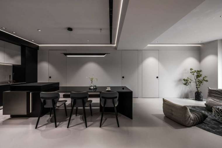 作品中沒有制式的軟裝,在維度空間中融入人性的溫柔與彈性,灰度色階淨空室內場域,讓窗外的陽光與綠意可以恣意揮灑,俐落的線燈引領著視覺的延伸,延展出舒適一室的生活態度,透過這樣簡約優雅單色調與線條的呈現反而更能導引出觀者豐富的內在心理色彩與層次立體,創造出客戶所期望與家人分享的純粹空間,演繹一部屬於自己心中最真實自由的「黑白畫映」。