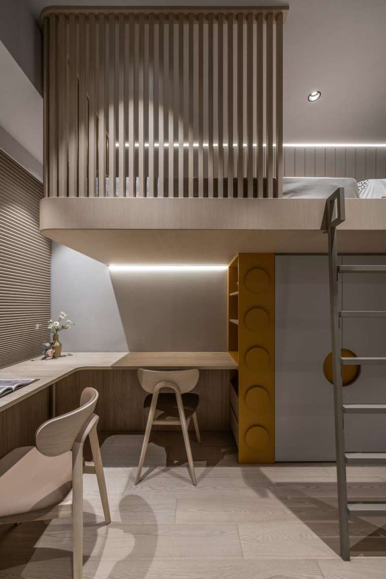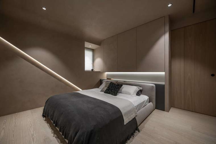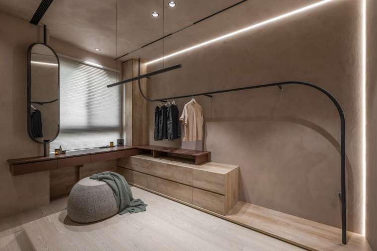 在進入主臥室區域時,首先會來到屋主的獨立更衣室,此處使用溫暖的大地色系進口礦物塗料作整體空間的色彩架構鋪陳,搭配實木地板營造出溫暖的異國度假風情。更衣室使用了大量的造型鐵件提供衣物的吊掛,在不造成衣櫃的量體厚重感同時也兼顧了衣物收納量。主臥房寢室區同樣以大地暖色礦物塗料為整體牆面主基調,利用了原本屋況建築牆面結構延伸了一道 45 度的燈光牆面,並另外透過框景的手法保留了一扇景觀採光窗台,為主臥空間增添了更獨特的氣質與靜謐氛圍。來到小孩房的區域,沿著面窗牆面亦設置了連續的桌面及收納,連結著另一側的上下床組收納規劃,架構組合成一個有著樂高表面造型的整體連續書桌床組及衣物收納量體設計。建材方面,全室選用國家級標準之合格綠建材,且壁面選擇天然塗裝建材作為大面積色塊呈現,親膚無毒,甲醛係數均符合安全範圍,以確保使用者在日常生活中安全無虞。