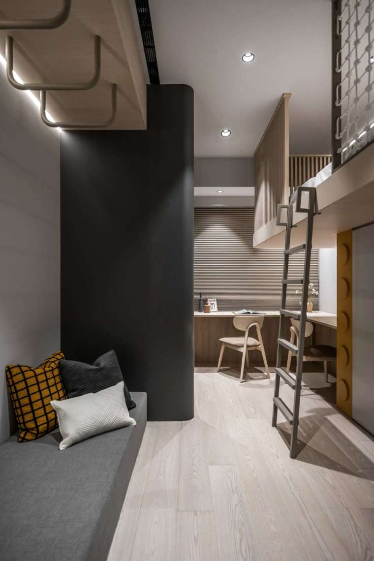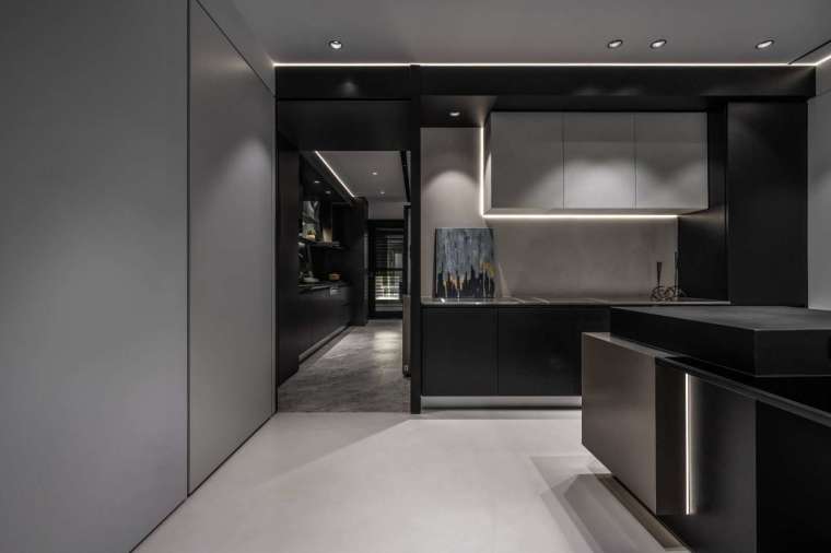 在色彩計畫中以黑、白、灰交織鋪陳,裸現空間框架與結構,按照公私領域的主題性區分出冷暖色調,公領域以藝術角度觀察、精準落筆,簡單勾勒的線條不介入任何詮釋,保有維度裡最純粹的樣子;私領域則綴入木紋,細膩的紋理表現拉開景深,流露生活舒適的樣貌。