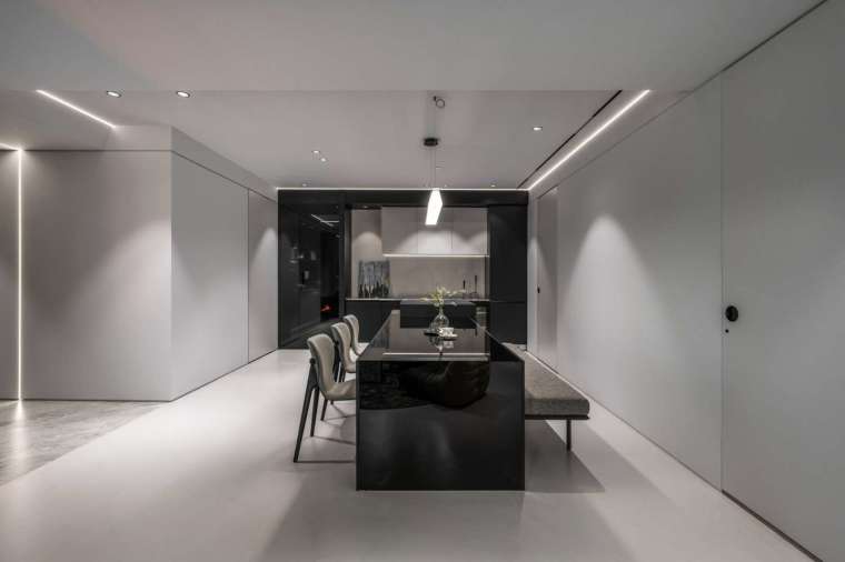 在本案中設計端捨棄了多餘的表象色彩與現代裝飾材質,回到了最原始的狀態,僅保留了最基本的黑白灰空間基調紋理,轉而將焦點著重在空間架構合理性、動線流暢律動、造型比例節奏與光影線條的優雅俐落上。