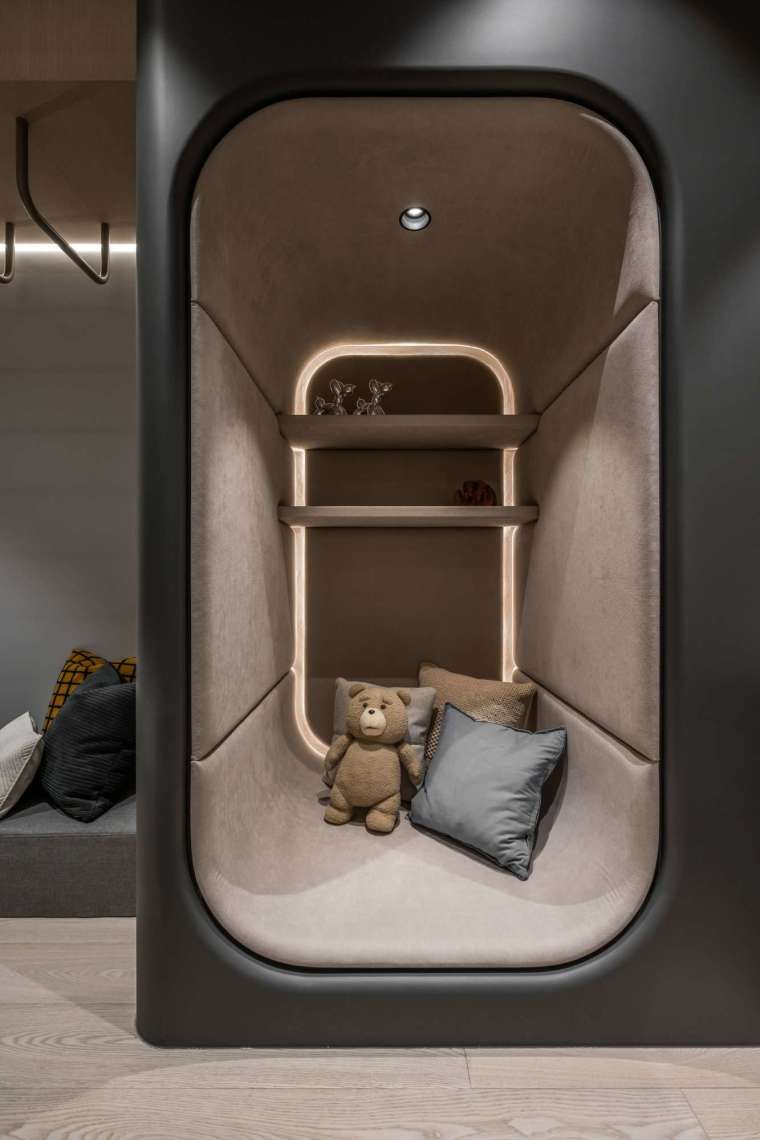 獨立的多功能視聽室兼具完整收納功能的書房功能,也因為有獨立的浴室與完善進口衛浴設備,同時達到客房的使用標準。設計端將地面抬高設定,區別進房無接縫盤多魔的地坪與房內實木地板地面,也創造了大量的收納空間同時為升降視聽設備以及預留安裝使用空間尺寸。