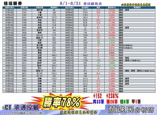 美股上漲,台股反彈,下一輪飆股我已經準備好了。顏老師不畏盤勢震盪,績效依舊維持在高檔,8 月勝率 78%,8 月獲利率 238%,其中 8/1 楠梓電 (2316)+19%,8/4 大量 (3167)+16%,8/6 神達 (3706)+58%,還有好多好績效,請密切追蹤顏老師官方 LINE@粉絲團,在不影響會員權益之下,對 Line@粉絲團的投資朋友分享會員訊息,更多會員績效邀請您一起來做見證,第一手訊息、布局飆股機會請私訊老師【Line ID】搜尋 @v588168,請密切鎖定 LINE@粉絲團關注!