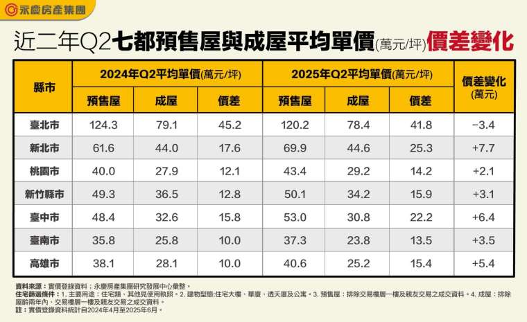 至於台北市,是七都中預售與成屋價差縮小的都會區。由於台北市房市需求較為穩定,加上成屋市場受惠於市中心稀缺性與地段優勢,價格相對抗跌,即便中古屋也具備替代效應,支撐成屋價格不至於明顯下修,因此整體價格不若其他縣市變動大。