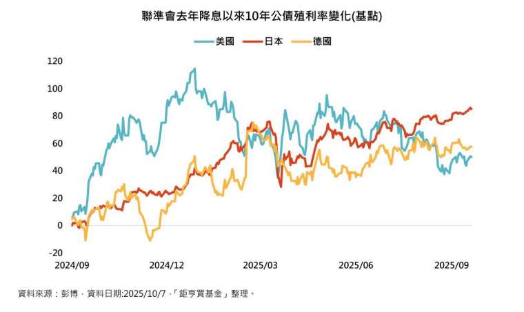 然而,這樣的政策方向並非沒有代價。高市的計畫中包含多項減稅方案與財政支出等擴張措施,雖有助於短期提升經濟成長,卻可能推高政府財政赤字,對中長期債券市場帶來壓力。觀察美國、日本、德國三大成熟經濟體,自 2024 年 9 月聯準會開始降息以來,十年期公債殖利率卻同步走升,顯示市場預期政府財政赤字將進一步擴大,並認為政府對通膨與財政紀律的重視程度正逐步下滑。