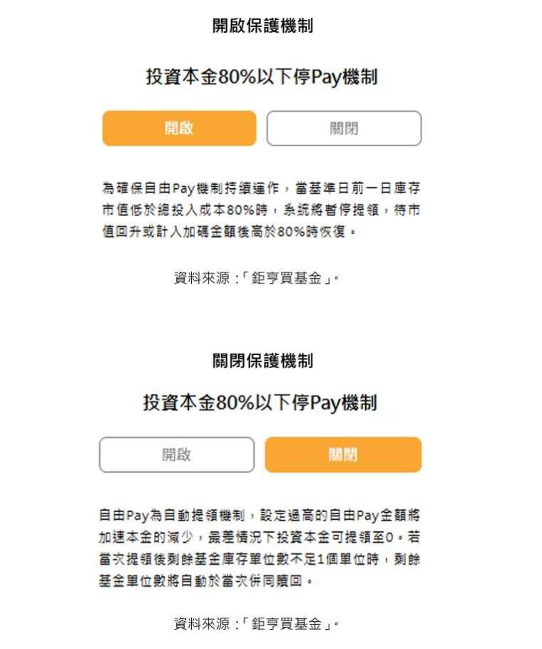 《鉅亨自由 Pay》將「加碼」與「本金防護」兩項機制同步升級。首先,單筆加碼金額的最低門檻降至 3,000 元,讓小額補位更容易執行,靈活掌握進場節奏。同時新增「下檔保護開關」功能,當「庫存市值低於總投入成本的 80%」時,可自行選擇是否開啟自動暫停提領,以避免本金被侵蝕;但若希望維持穩定現金流,也能關閉此功能,讓提領不中斷。透過這項設計,提領運用更具彈性與自主性,能在不同市場環境下靈活應變,兼顧本金防護與現金流續航力。