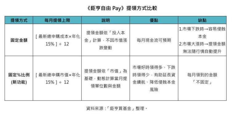 原《鉅亨自由 Pay》採「固定金額提領」,每月依照自己設定的金額領出固定現金流,領多少一開始就知道,現金流相對穩定,適合每月有固定支出的人。不過在市場波動時會遇到一些問題:市場下跌時如果仍照原本的固定金額領,很容易領太多、侵蝕本金;而市場上漲時又可能領太少,無法充分享受資產增長帶來的收益。