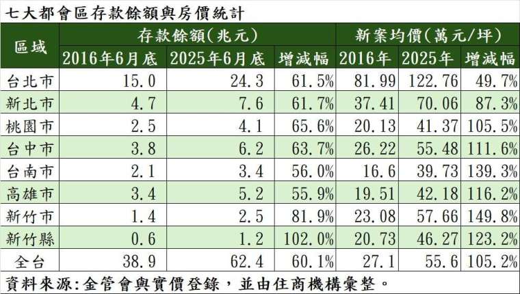 住商機構彙整金管會統計,全台存款餘額相較 10 年前大增 60%,截至今年 6 月底為止已達 62.4 兆元,其中大多集中於六大都會區,並以台北市 24.3 兆元、新北市 7.6 兆元及台中市達 6.2 兆元登錄最多:而若觀察實價,全台房價飆漲速度甚至更勝於存款增幅,2016 年全台新案均價約達每坪 27.1 萬元,到今年為止,平均新案行情已達 55.6 萬元,漲勢達 105.2%。