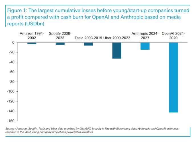 MarketWatch 報導,首先,德銀的團隊根據媒體報導的 OpenAI 的支出與營收預測,推估該公司從 2024 年到 2029 年預期會「燒掉」多少資金。接著,他們把這項數字與亞馬遜 (AMZN-US)、特斯拉 (TSLA-US)、Spotify(SPOT-US) 與 Uber(UBER-US) 在實現獲利之前累計的虧損規模,進行比較。