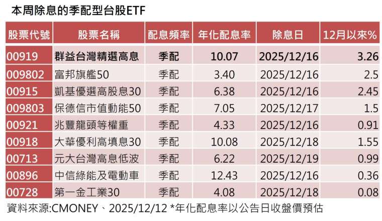 2025 年最後一波台股 ETF 除息旺季登場,統計本周 15 至 19 日將有包括群益台灣精選高息 (00919-TW)、元大台灣高息低波 (00713-TW) 等共 9 檔季配型台股 ETF 展開除息,吸引逾 217 萬位受益人關注。進一步觀察這些將除息的台股 ETF 中,以預估年化配息率來看,00919、00896、00918 三檔都有 10% 以上的表現。