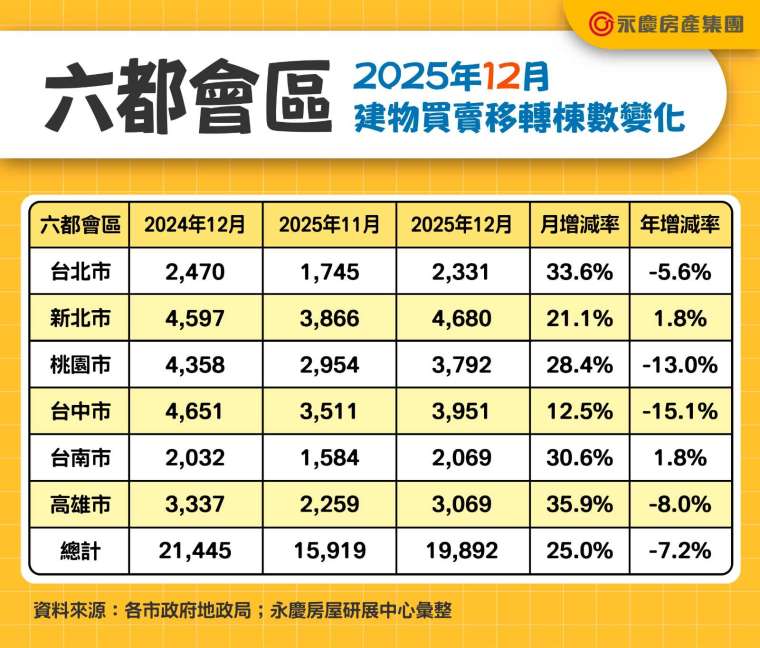 全台六都會區公布 2025 年 12 月「建物買賣移轉棟數」,六都交易量合計為 1 萬 9,892 棟,創下今年單月最高交易量,月增 25%,年減 7.2%,2025 年 1-12 月 移轉棟數爲 20 萬 4,596 棟,年減 24.6%,爲全台六都單年史上最大衰退幅度,而以六都約占全國 8 成的移轉棟推估,信義 (9940-TW) 及永慶估去年全台的建物買賣移轉棟數有望保住 26 萬棟。