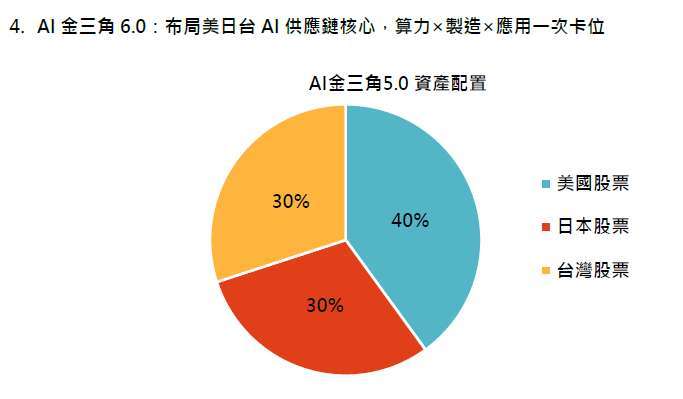 「AI 金三角」以「美國 × 日本 × 台灣」三大科技熱區為核心配置,一次布局 AI 成長最關鍵的三條主線:創新應用、智慧製造、算力供應鏈。透過投組方式參與趨勢,不必押注單一市場,也能更有紀律地掌握長線機會。美國是 AI 創新的主舞台,從大型語言模型、雲端運算到機器人與各式應用生態,商轉速度快、成長空間大。日本政策推動與產業升級,智慧製造與機器人加速落地,尤其在人力短缺的結構性需求帶動下,相關企業有望持續受惠。台灣則扮演 AI 硬體升級的核心樞紐,憑藉晶圓代工、先進封裝與高階製程的領先地位,長期站穩全球 AI 供應鏈關鍵位置。因應 AI 需求持續增溫,我們本季調整配置,將原本組合中的日股基金汰換一檔更聚焦於工業與科技比重較高的標的,使整體資產配置更貼近 AI 主線發展方向,強化投資組合的成長動能。